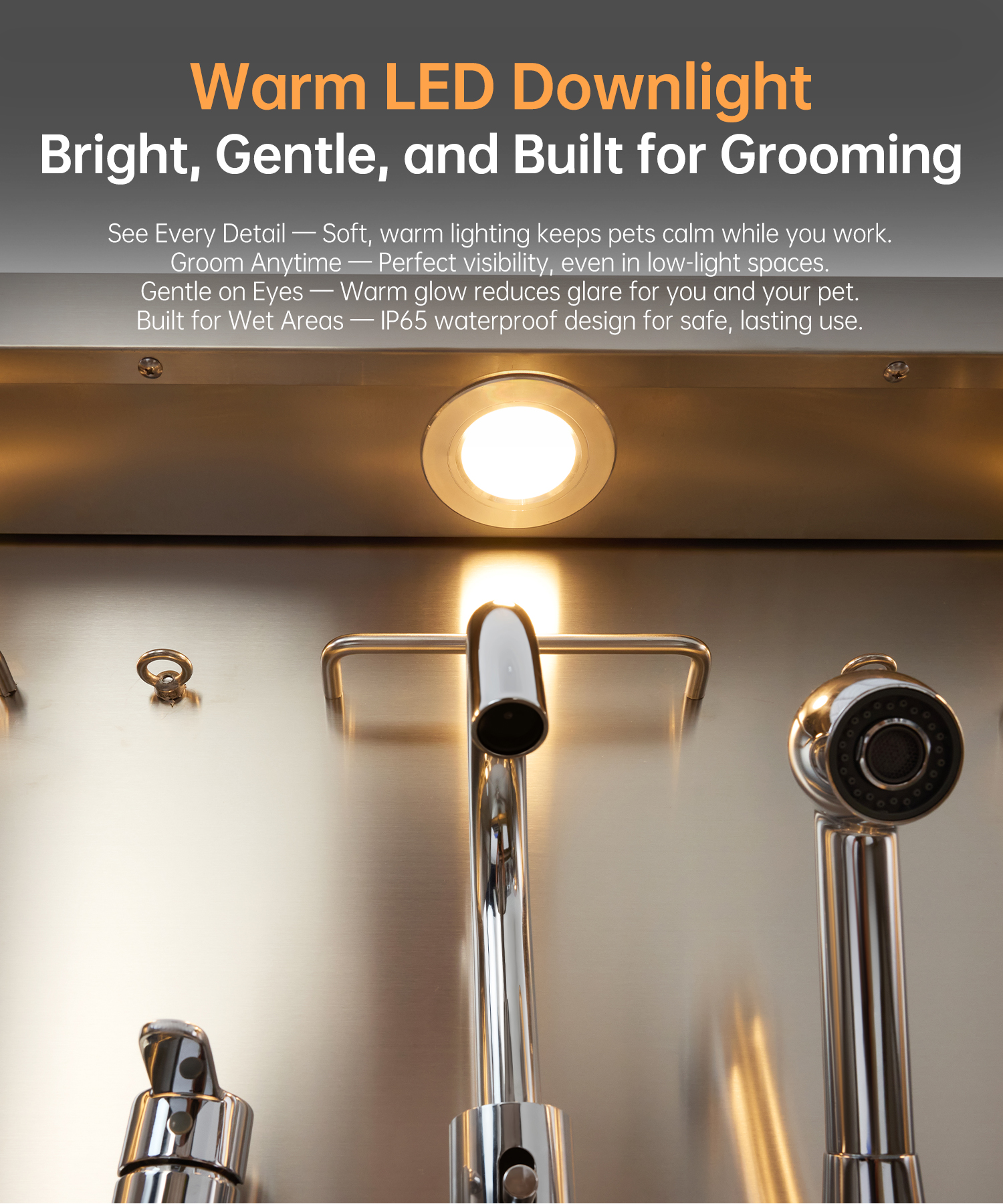 Innovative and Practical Design: The POLIMO dog grooming station features multiple outstanding design elements: ① 100% Waterproof high-brightness LED spotlight. ② Grade A tempered glass observation window. ③ The bathtub’s side panels feature a curved slide design, making it easier to operate④ Two-piece floor grid, adjustable to three different heights. ⑤ Sliding storage drawer for organized storage. ⑥ Multi-function faucet and showerhead, adjustable to left, center, or right positions