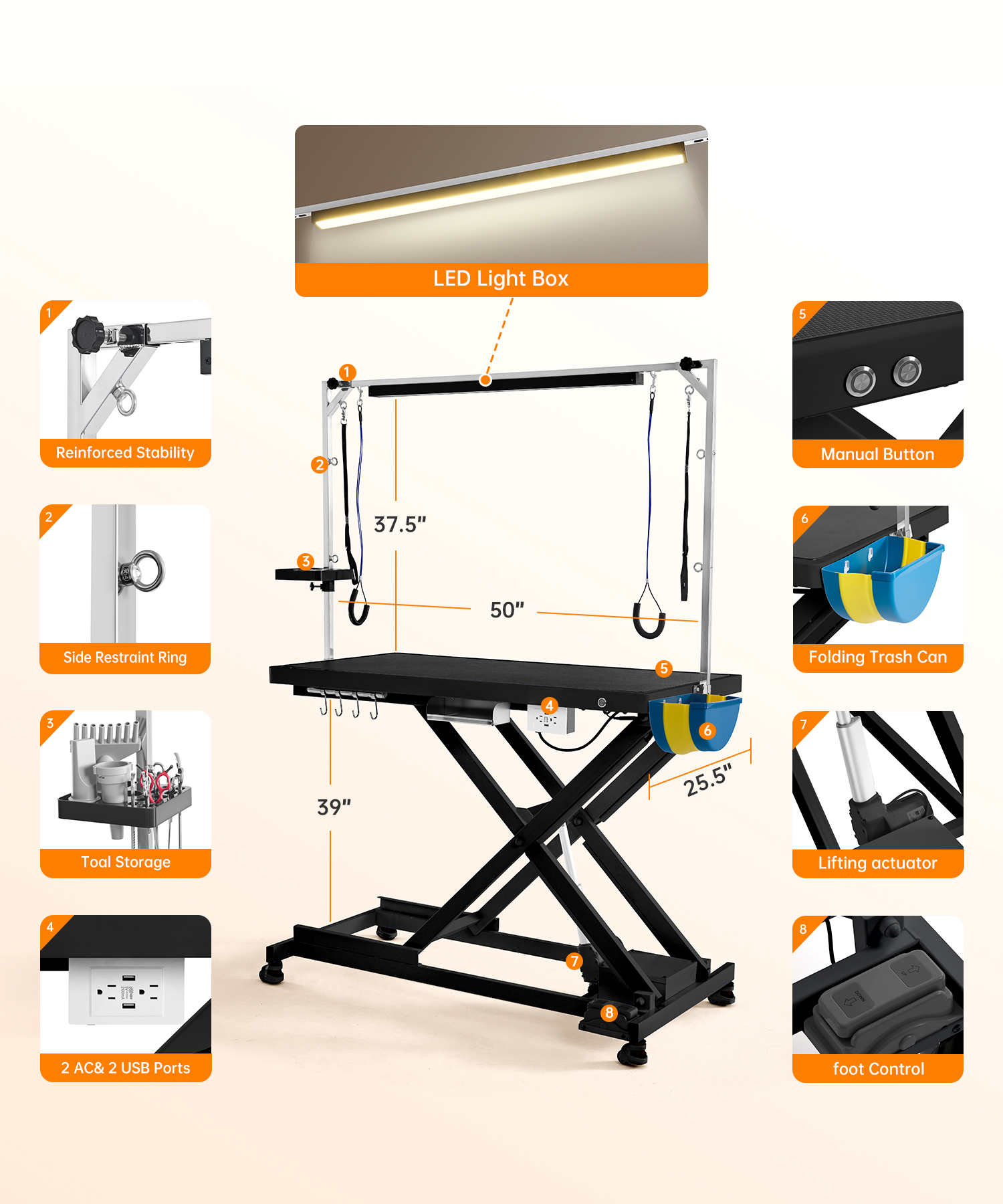 LED LIGHTING & MULTI-ANGLE HEIGHT CONTROL – This electric dog grooming table comes with a soft LED light to help reduce pet anxiety and improve visibility in dim environments. Its innovative design includes both button and foot pedal height controls, placed on separate sides for 360° multi-angle operation—allowing you to adjust the height from any position without interrupting your grooming process.